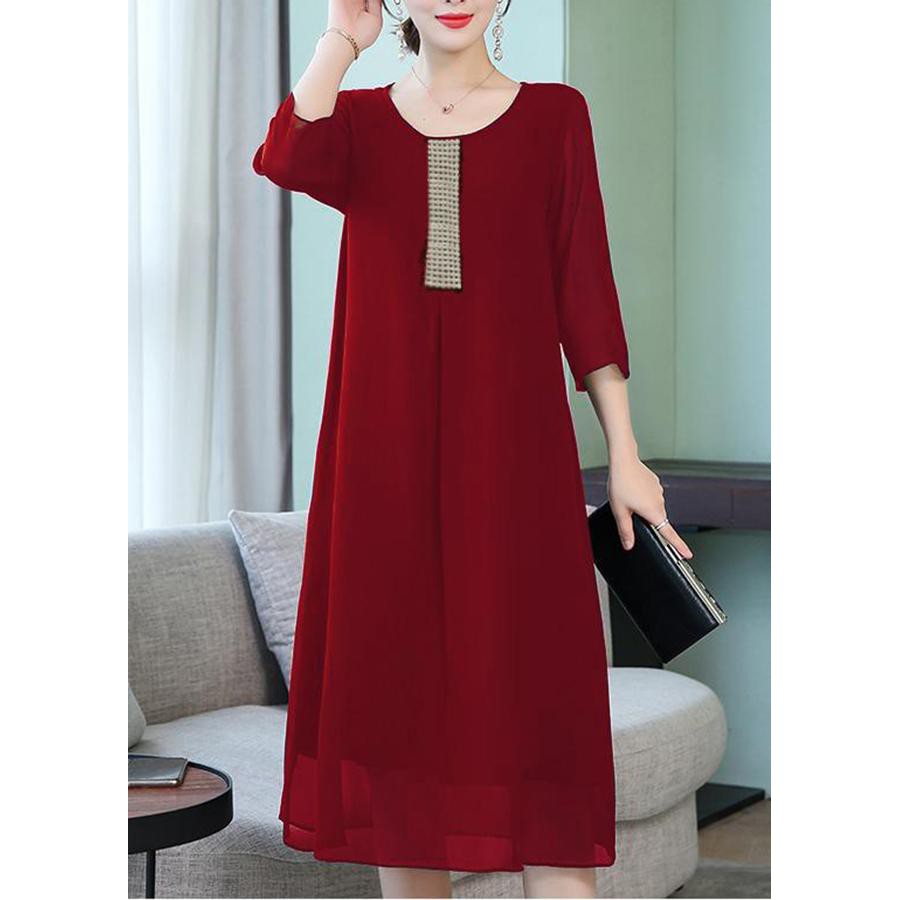 Ngày nay, phụ nữ trung niên thường có xu hướng đa dạng các trang phục và dễ bắt nhịp với phong cách hiện đại. Vậy nên, bạn đừng quá đắn đo mà hãy chọn mua ngay tặng cho mẹ chồng tương lai một chiếc đầm đính đá trung niên sang trọng. Đầm Goti trung niên được thiết kế kiểu tay lỡ, xẻ tà trước, chất liệu đầm bằng vải voan Hàn Quốc mát mẻ và co giãn tốt, điểm nhấn của đầm là các hạt đá được đính nơi cổ áo vô cùng tinh tế và quý phái.