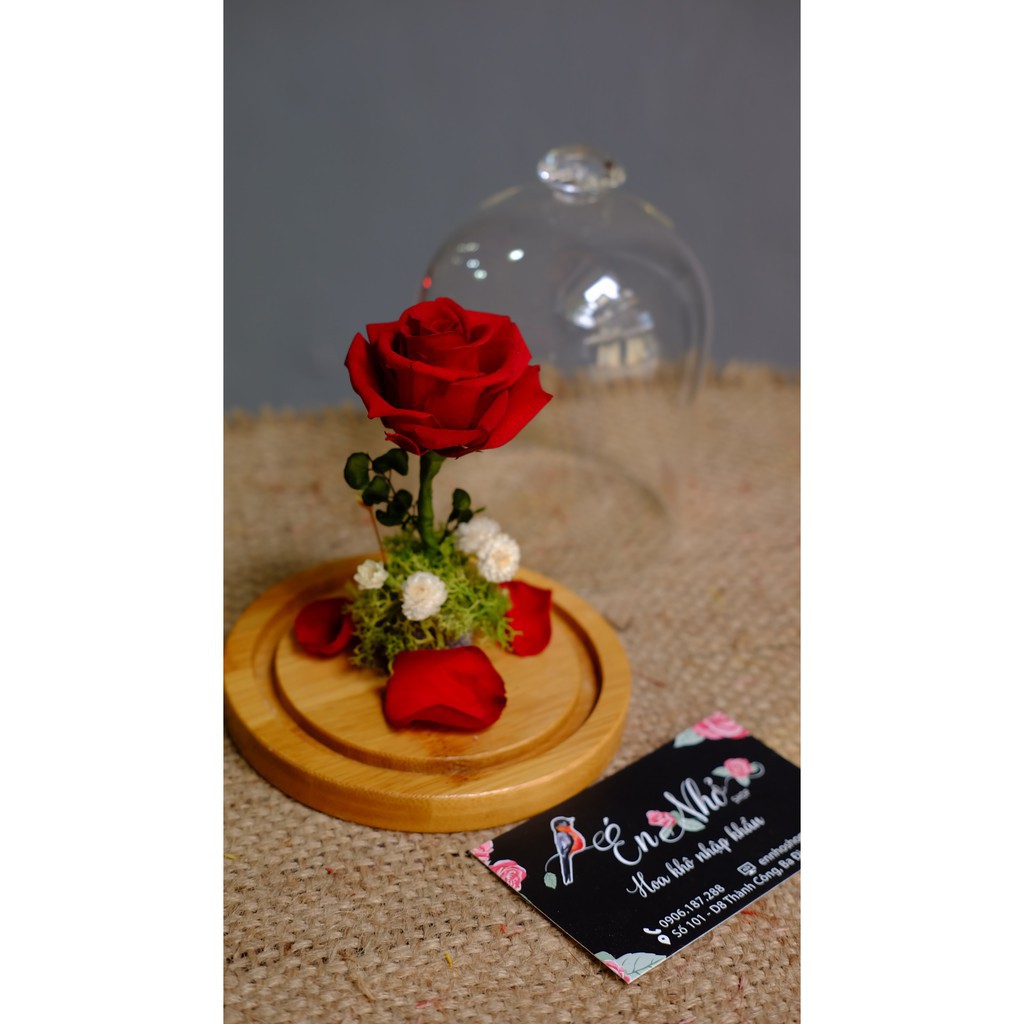 Lấy cảm hứng từ câu chuyện tình lãng mạn "Người đẹp và quái vật" với bông hồng vĩnh cửu đựng trong lọ thủy tinh, giờ đây bạn có thể dành tặng người mình thương bông hoa hồng đẹp đẽ không tàn này. Hoa có kích thước lớn với đường kính lên tới 8cm được nhập khẩu từ Ecuador, sau đó được xử lý thủ công bởi những đôi tay lành nghề để có thể sẽ giữ nguyên độ mềm mại và màu sắc tươi mới đến hơn 3 năm. Đặc biệt, phần hộp đựng được thiết kế dạng lồng kính giống hệt trong phim, với kích thước 9cm x 9cm x 14cm, vừa lạ mắt lại hết sức sang trọng để làm quà tặng.