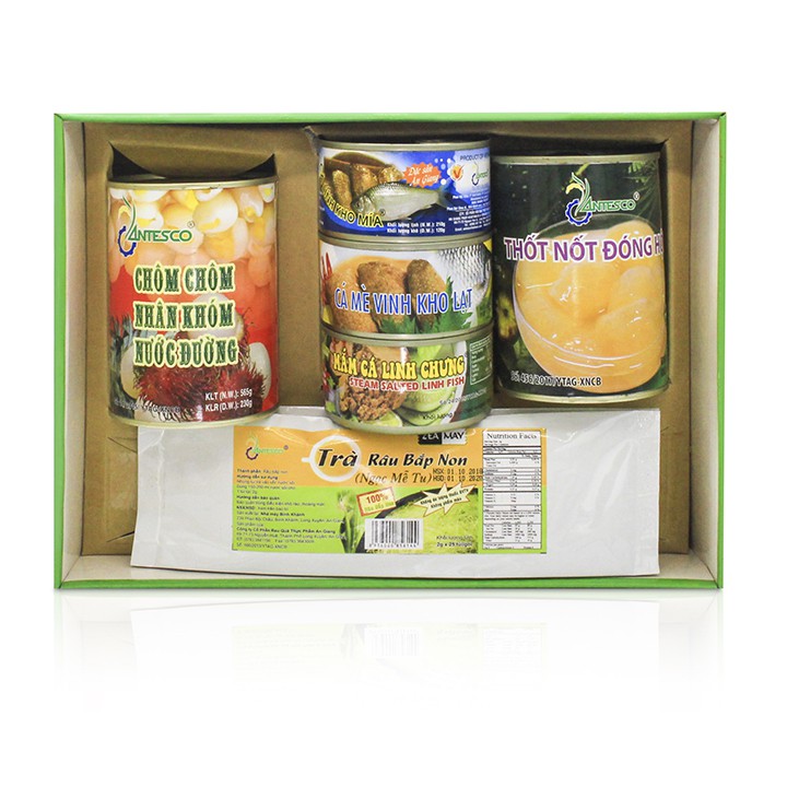 Bộ sản phẩm quà tặng cá và rau củ của thương hiệu Antesco gồm 6 sản phẩm là cá linh kho mía, mắm cá linh chưng, cá mè Vinh kho lạt, trà râu bắp non, chôm chôm nhân khóm và thốt nốt đóng hộp. Tất cả các sản phẩm này đều được chế biến theo quy trình đạt tiêu chuẩn từ nguồn nguyên liệu sạch, an toàn, hợp vệ sinh, có nguồn gốc xuất xứ rõ ràng, hoàn toàn không sử dụng phẩm màu, đảm bảo an toàn đối với sức khỏe người dùng. Hộp quà tặng cá và rau củ Antesco có thiết kế mẫu mã đẹp mắt, sang trọng, rất phù hợp để làm quà biếu Tết.