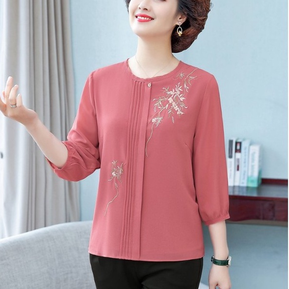 Áo sơ mi cũng là một item thời trang được nhiều phụ nữ tuổi 50 yêu thích và ưu ái lựa chọn. Áo trung niên sơ mi cổ tròn thêu hoa này giúp tôn lên vẻ đẹp lịch sự, trang nhã của người phụ nữ, với phom dáng thoải mái, thanh lịch. Chất liệu voan của sản phẩm rất bay, thoáng khí và có độ co giãn nhẹ, tạo sự mềm mại, mịn mượt khi mặc. Áo có cổ tròn, được thêu hình hoa ly đẹp và tinh tế.