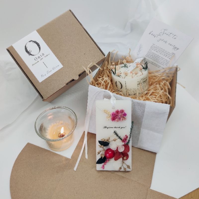 Set quà gồm nến thơm để đốt và sáp thơm để treo trong tủ quần áo hoặc treo trang trí trong nhà, xe hơi... vừa làm thơm không gian lại tăng thêm nét thẩm mỹ, nghệ thuật. Nến và sáp thơm đều được làm từ các thành phần thiên nhiên an toàn cho sức khỏe như sáp đậu nành, sáp ong, tinh dầu thiên nhiên... Với cách trang trí đầy sáng tạo, sản phẩm được điểm xuyến thêm những bông hoa khô hay những miếng cam, quýt... tùy theo mùi hương nhìn rất nghệ thuật và độc đáo. Nến có thời gian đốt từ 12-15h, sáp thơm có thể lưu hương từ 3-4 tháng (độ tỏa hương sẽ lâu hơn nếu được đặt trong không gian kín gió).
