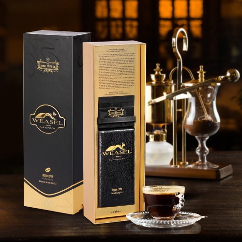Cà phê chồn được mệnh danh là loại cà phê quý hiếm và tinh tuý vào bậc nhất thế giới với hương vị độc đáo và tinh tế mà không loại cà phê nào sánh bằng. KING COFFEE WEASEL là một siêu phẩm cà phê chồn được tạo nên nhờ quá trình tinh chế hoàn hảo qua 9 giai đoạn, xứng đáng là món quà Tết dành tặng khách quý. Âm hưởng của rừng già ẩn hiện rồi bùng nổ sâu trong những tầng vị phức tạp của tách cà phê đậm đà, nồng nàn toả đi hương thơm quyến rũ mà tao nhã, giúp tinh thần thăng hoa, trí tuệ được đánh thức để kiến tạo nên những sáng tạo tuyệt vời và vĩ đại.