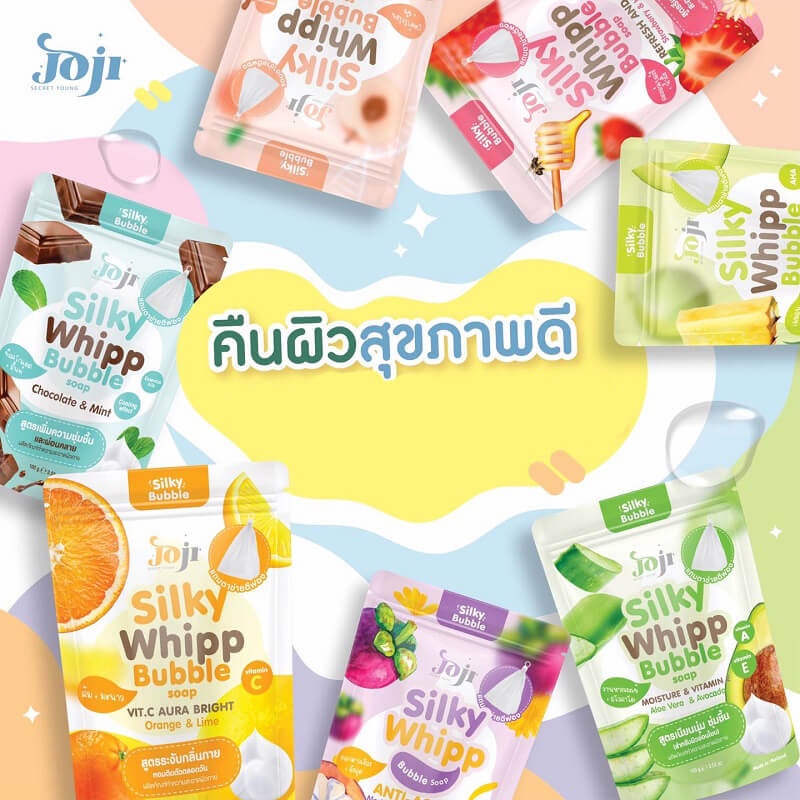 Xà phòng tắm trắng da JOJI Secret Young Silky Whipp Bubble Soap đến từ Thái Lan có 7 công thức giúp cho làn da mềm mịn, căng bóng. JOJI Secret Young Silky Whipp Bubble Soap Moisture & Vitamin E có thể phục hồi làn da đen sạm nhờ công thức chiết xuất từ nha đam, bơ. JOJI Secret Young Silky Whipp Bubble Soap Anti-Acne có thể giảm mụn, nếp nhăn, trẻ hoá làn da bởi sự kết hợp giữa cúc vạn thọ và măng cụt. JOJI Secret Young Silky Whipp Bubble Soap Bright Collagen lại thúc đẩy làn da mịn màng, tươi trẻ bởi công thức kết hợp glutathione và đào.