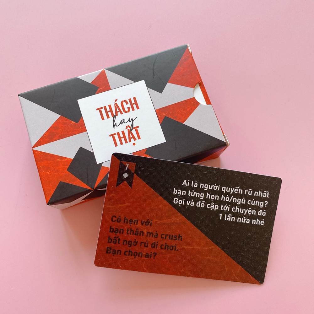 Bộ bài Thách hay thật là làn gió mới cho bữa tiệc, giúp nhóm bạn được cháy hết mình và các cặp đôi đang để ý đến nhau có cơ hội được biết thêm những điều thú vị về crush của mình. Bộ bài bao gồm 52 lá bài, kích thước 6cm x 10cm, được làm từ chất liệu bìa cứng có lớp cán chống nước nên không lo bị gãy bài, in hình rõ nét hai mặt, bền đẹp, đầy màu sắc. Luật chơi cũng rất đơn giản khi tất cả nhóm bạn ngồi thành vòng tròn, dùng chai bia hoặc vòng quay trong điện thoại để quay, trúng ai thì người đó bốc một lá bài và lựa chọn trả lời thật hoặc làm hành động như mọi người yêu cầu.