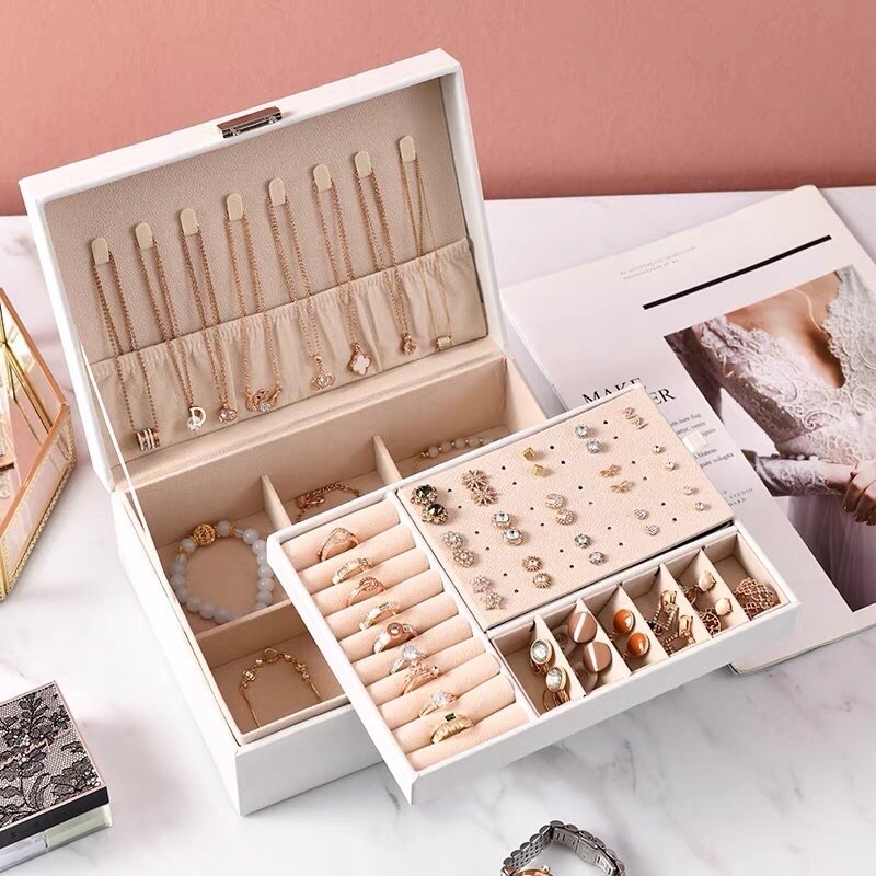 Hộp đựng trang sức hai tầng bọc da có khóa này chính là sản phẩm mà bạn đang tìm kiếm để có thể đựng vừa những món đồ trang sức đang vứt lăn lóc khắp nơi trong căn nhà của bạn bởi tính ứng dụng cực kỳ cao của nó.