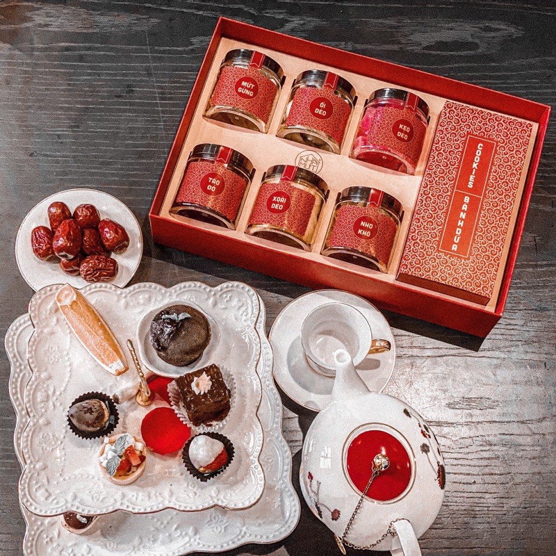 Hộp mứt Tết mix 8 vị: mứt gừng, mứt xoài sấy dẻo, mứt ổi sấy dẻo, nho khô, mứt táo đỏ, kẹo trái cây dẻo, bánh dứa và bánh cookies chocolate; mỗi vị được đựng trong 1 hũ thủy tinh xinh xắn và được gói lại thật đẹp trong 1 hộp giấy màu đỏ sang trọng. Món quà sẽ là lời chúc mừng gia chủ sẽ đón một năm mới nhiều may mắn, đủ đầy và làm ăn phát đạt.