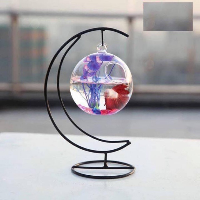 Chi phí cho một hồ cá mini cung trăng không quá cao, ngoài để nuôi cá còn có tác dụng trang trí cho bàn học, bàn làm việc. Hồ cá cao 28cm đường kính bể 16cm giá treo được làm bằng thép, sơn tĩnh điện và uốn cong rất nghệ thuật. Khi mua sản phẩm bạn được tặng kèm theo cây giả trang trí và sỏi. Với kích thước trên bể phù hợp nuôi các loại cá như Lia Thia, cá Chọi, cá Betta,..