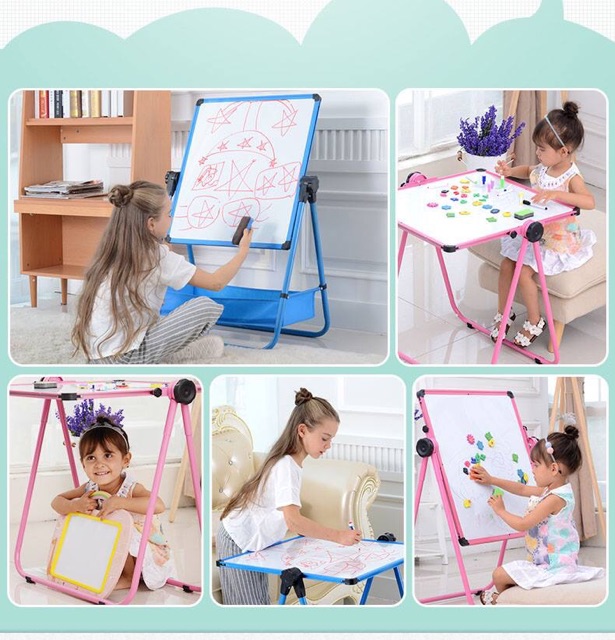 Bảng vẽ hai mặt cho bé có kích thước 53cm x 48cm x 102cm, đi kèm với các phụ kiện bao gồm 2 bút màu, 1 hộp phấn, 2 nam châm, 1 miếng lau bảng và 1 giỏ đựng đồ. Bảng vẽ có hai mặt: bảng màu trắng dùng để viết bút màu và bảng màu xanh để viết phấn. Mặt bảng làm bằng chất liệu có từ tính để dính các phụ kiện bằng nam châm, hỗ trợ trẻ học tập dễ dàng. Bảng có chốt điều chỉnh ngang dọc, cao thấp, có thể xoay được 360 độ, hỗ trợ trẻ viết vẽ trong mọi tư thế.