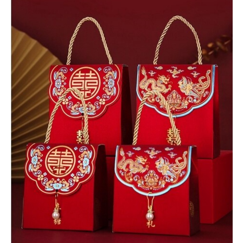 Màu đỏ là một trong những tông màu chủ đạo trong đám cưới của người phương Đông đặc biệt là Trung Quốc và Việt Nam. Người ta quan niệm rằng màu đỏ là màu sắc mang đến sự may mắn, tài lộc và hạnh phúc. Vì thế lựa chọn hộp quà màu đỏ may mắn làm quà tặng cho khách mời trong đám cưới là ý tưởng hay hai bạn nên tham khảo. Hộp quà được thiết kế dạng túi xách được làm từ chất liệu giấy màu đỏ may mắn. Món quà tặng vô cùng độc đáo này sẽ là một trong những kỉ vật chứa đựng kỉ niệm ngọt ngào của hai bạn.