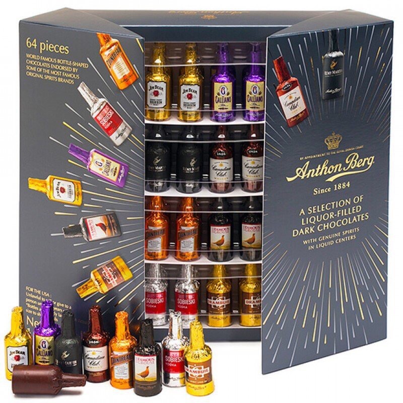 Nếu hai bạn là những người trẻ năng động, vừa yêu Chocolate vừa thích những hương vị rượu mạnh nồng nàn thì hãy lựa chọn sản phẩm Chocolate nhân rượu độc đáo này từ thương hiệu Anthon Berg Since 1884 đến từ nước Mỹ nhé! Bộ sản phẩm Chocolate Rượu 64 chai mang đến cho bạn sự kết hợp hài hòa giữa hương vị sô-cô-la cao cấp và các thương hiệu rượu nổi tiếng như: ® Rémy Martin, Grand Marnier ®, … Có tổng cộng 8 mùi rượu cho bộ Chocolate đặc biệt này gồm: Galliano, Drambuie, Borghetti Cafe Espresso Liquor, Cointrea Brandy, Danzka Cranberry Vodka, Grand Marnier Liqueur, Jack Daniel's Old No. 7 Whiskey và Cutty Sark Scotch Whisky.