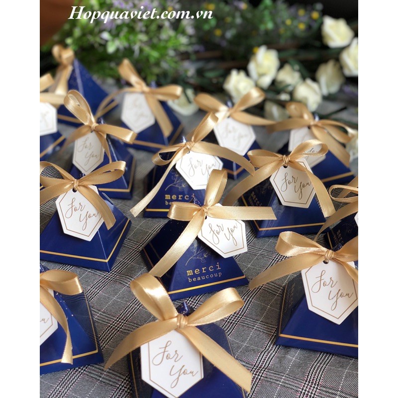 Quà tặng trong đám cưới là một phần không thể thiếu của nhiều vợ chồng để thay cho lời cảm ơn đến khách mời đã đến chứng kiến khoảnh khắc hạnh phúc của các cặp đôi. Một hộp quà nhỏ nhắn nhưng lại là món quà ý nghĩa được nhiều người lựa chọn làm quà tặng trong đám cưới. Sản phẩm được làm thủ công với kích thước nhỏ nhắn có kèm theo cả nơ và tag ghi dòng chữ "for you" thể hiện sự chỉn chu trong việc tổ chức đám cưới của hai bạn và cũng là một kỷ niệm đẹp trong đám cưới.