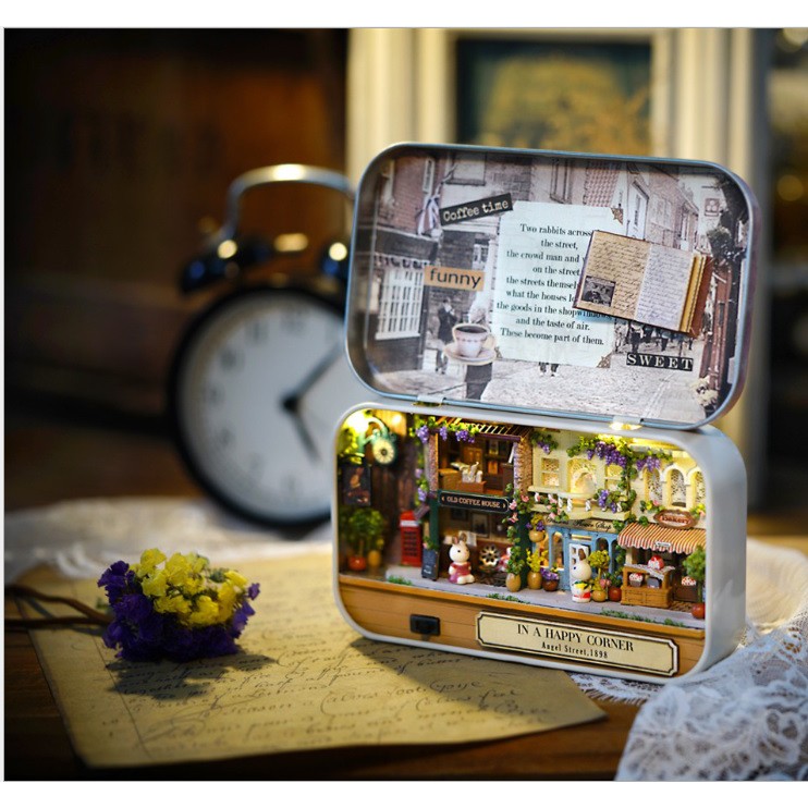 Hộp quà mô hình nhà gỗ DIY là món quà lưu niệm được làm từ những vật liệu như: nhựa, vải, giấy decan, đèn led và keo sữa. Các chi tiết lắp ráp và mô phỏng chính xác, tỉ mỉ giống như hình ảnh thật. Bạn có thể tự tay lắp ráp theo sự sáng tạo và sở thích của mình. Chủ đề của mô hình là một con phố nhỏ có những quán cafe, tiệm sách, cửa hàng bán hoa,...xinh xắn, được trang trí nhiều màu sắc. Mô hình dùng để trang trí cho góc học tập, làm việc thêm sinh động cũng như làm tăng cảm xúc, trau dồi tính kiên trì, nẫn nại. Hộp đựng bên ngoài được làm bằng thiếc có kích thước 14.3x 8.4 x 2.6 cm nhỏ gọn và không chiếm nhiều diện tích không gian.