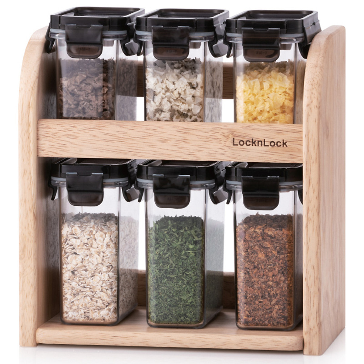 Hộp Đựng Gia Vị Lock&Lock Modular HTE571S6 6 Chiếc (3 Chiếc 180ml Và 3 Chiếc 250ml) + Giá Gỗ sẽ là một lựa chọn xuất sắc cho món quà tân gia của bạn. Với thân hộp làm bằng chất liệu tritan an toàn tuyệt đối, thiết kế nhỏ gọn, trong suốt vừa mang lại hiệu quả thẩm mỹ cao, vừa giúp nhìn rõ được thực phẩm bên trong mà không cần nhãn dán. Nắp hộp làm từ nhựa PP cao cấp và silicone đảm bảo kín hơi, bảo quản gia vị an toàn tuyệt đối, chống ẩm kết hợp với miệng rót nhỏ, dễ dàng kiểm soát được liều lượng gia vị khi sử dụng. Tổng thể sản phẩm bao gồm hộp và kệ đựng có kích thước dài 20cm, rộng 11,5cm, cao 21,8cm và trọng lượng 1,13kg, giúp tiết kiệm không gian cho ngăn bếp nhỏ, thích hợp cho nhu cầu nấu ăn và sử dụng gia vị toàn vẹn cho căn bếp trong ngôi nhà.