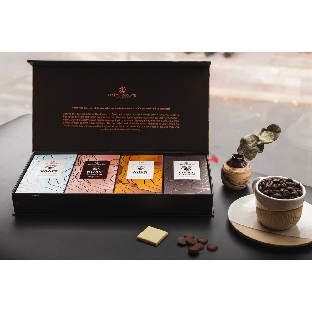 Bạn sẽ tìm thấy rất nhiều loại chocolate với đa dạng công thức kết hợp từ cacao tươi ngon được chọn lọc bởi các chuyên gia từ D'art. Hiện tại D'art có 4 loại socola như: socola thanh, socola tươi, socola nghệ thuật và socola Neapolitans với nhiều mùi hương trộn lẫn trong chiếc hộp sang trọng. Bên cạnh đó, D'art còn độc quyền mang về thị trường Việt Nam loại socola đứng thứ 4 thế giới là Socola Hồng Ngọc (Ruby) cùng rất nhiều loại socola với đa dạng quà tặng bạn có thể tặng cho người thân, người yêu và bạn bè vào các dịp lễ mừng quan trọng.