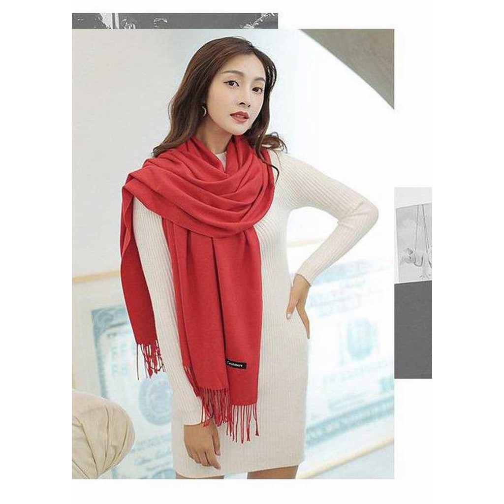Khăn choàng cổ len dạ màu đỏ trơn là một item khăn quàng rất xinh và ấm áp mà bạn có thể tham khảo. Khăn được làm từ chất liệu cashmere vừa nhẹ lại vừa mềm mại, ấm áp. Khăn sở hữu thiết kế tinh tế với họa tiết đơn giản, hiện đại và sang trọng, rất dễ phối đồ. Kích thước của khăn là 60cm x 200cm, phù hợp để làm món đồ phụ kiện thời trang khi đi làm, đi chơi, đi du lịch, đi biển,... Màu sắc đỏ tươi tắn của khăn choàng rất tôn da và cũng rất dễ kết hợp cùng các loại trang phục khác nhau. Chắc chắn chiếc khăn này sẽ hợp gu nàng và khiến nàng cảm thấy vui mừng, thích thú khi nhận được từ bạn đấy.