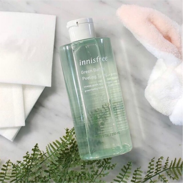Có thể nói đảo Jeju chính là "nàng thơ" của Innisfree. Chất đất trồng của đảo được bồi đắp bởi tro núi lửa nên hết sức màu mỡ, hoàn toàn không sử dụng hóa chất. Do đó, các loại cây trồng nơi đây cũng có thành phần dinh dưỡng nhiều hơn hẳn giống cây cùng loại nhưng canh tác ở nơi khác. Những bông lúa mạch xanh trồng tại Gapa, Jeju kết tinh dồi dào protein, chất xơ, và rất nhiều dưỡng chất tốt cho làn da. Sau khi thu hoạch, lúa mạch sẽ được Innisfree sản xuất thành dấm lúa mạch xanh và đưa vào nước hoa hồng Innisfree Green Barley Peeling Toner. Nhờ cách thức canh tác cây trồng và quá trình điều chế "xanh" như vậy, nên thành phần AHA tự nhiên trong lúa mạch được bảo toàn nguyên vẹn, giúp nhẹ nhàng loại bỏ tế bào chết và dầu thừa trên da, làm da sáng mịn hơn. Ngoài ra, toner cũng được bổ sung hyaluronic acid, một chất ngậm nước dạng phân tử nhỏ, tạo nên lớp màng khóa ẩm, giúp tăng độ đàn hồi cho da và bảo vệ da trước tác hại của môi trường.