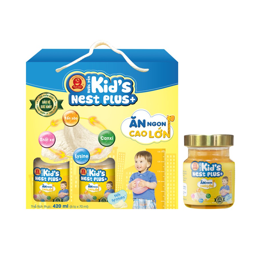 Chúng ta có lẽ ai cũng biết công dụng bồi bổ sức khỏe tuyệt vời của yến, nếu bé nhà bạn là đứa trẻ kén ăn thì nước yến là một sản phẩm bổ sung rất tốt dưỡng chất cho bé. Sản phẩm nước yến Kid’s Nest Plus+ lọ 70ml được chế biến từ các tổ yến tự nhiên và được bổ sung thêm canxi, lysine và chất xơ giúp bé thêm khỏe mạnh, thèm ăn và tăng cân. Sản phẩm có thể uống ngay mà không cần chế biến.
