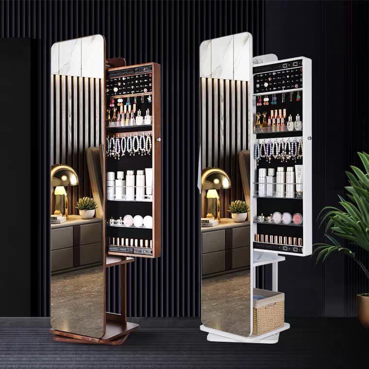 Gương soi toàn thân đa năng kết hợp giữa tủ đựng đồ trang điểm và giá treo quần áo là sản phẩm thông minh rất phù hợp cho phòng ngủ có phong cách hiện đại. Gương có chiều dài 1,7m, rộng 56cm đủ kích thước cần thiết để soi toàn thân, mang đến diện mạo hoàn chỉnh nhất cho bạn. Sản phẩm có thiết kế đặc biệt, hội tụ 4 chức năng trong một đó là Gương soi toàn thân, Kệ để đồ, Giá treo đồ và Tủ mỹ phẩm, phụ kiện. Với chiếc gương này, bạn có thể lược bỏ bàn trang điểm trong phòng, tiết kiệm không gian nếu phòng có diện tích nhỏ. Sản phẩm được làm từ gỗ cao cấp, phủ melamine đảm bảo độ bền chắc. Gương được tráng bạc tràn viền, cho độ nét cao, mang đến hình ảnh chân thực nhất dành cho bạn.