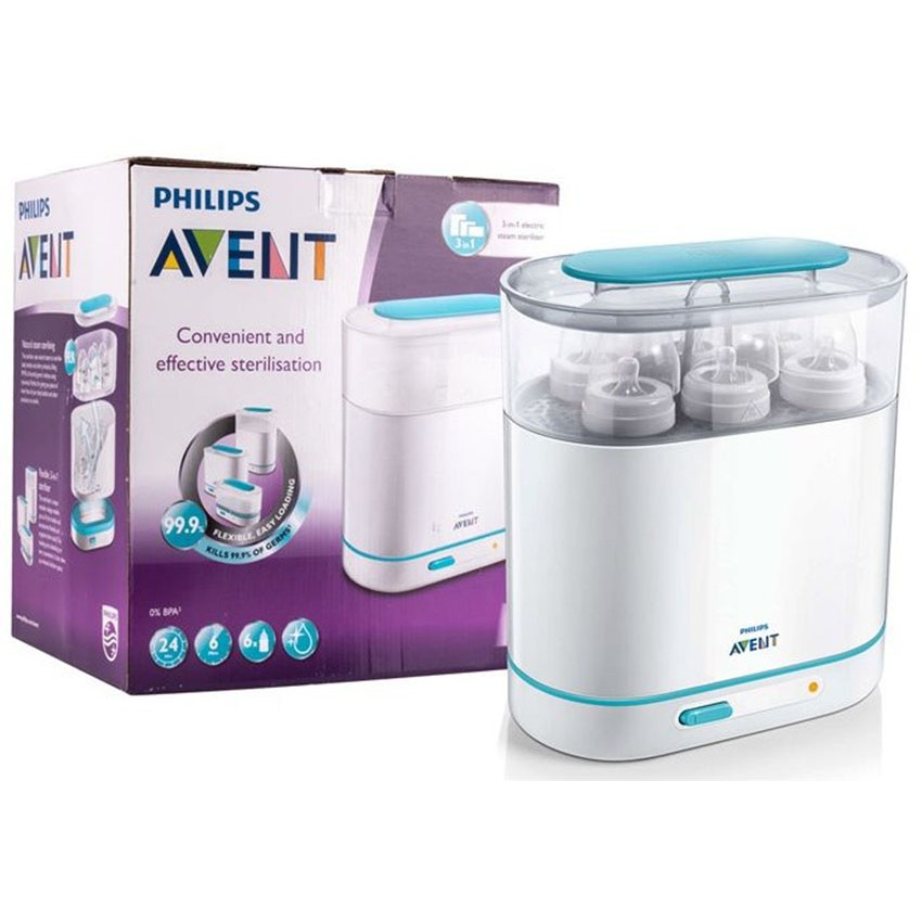 Máy tiệt trùng bình sữa Philips Avent 3 trong 1 - 284.02 được thiết kế để làm giảm tối đa công sức các ông bố bà mẹ phải bỏ ra để tiệt trùng bình sữa cho con, giúp việc cho bé uống sữa trở nên đơn giản nhất có thể. Nhờ kích thước có thể điều chỉnh linh hoạt, thiết bị tiệt trùng Philips Avent 3 trong 1 vừa khít với nhiều đồ vật khác nhau đồng thời chiếm rất ít không gian phòng bếp. Chức năng 3 trong 1 của máy tiệt trùng bình sữa Philips Avent bao gồm tiệt trùng ti ngậm với cấu hình kích thước nhỏ; tiệt trùng dụng cụ hút sữa, đĩa cho trẻ ăn dặm, dao và dĩa với cấu hình kích thước vừa; tiệt trùng 6 bình sữa Philips Avent 11 oz / 330 ml với cấu hình kích thước lớn. Bình sữa và các phụ kiện được tiệt trùng trong vòng 6 phút, sau đó thiết bị sẽ tự động ngắt để đảm bảo an toàn và tiêu thụ ít năng lượng hơn. Phương pháp tiệt trùng hơi nước của bệnh viện được áp dụng cho máy tiệt trùng bình sữa Philips Avent 3 trong 1 giúp tiêu diệt 99,9% vi khuẩn có hại.