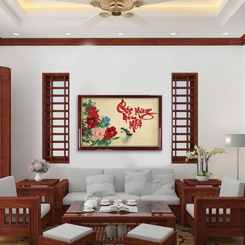 Tranh ép gỗ treo tường viết chữ thư pháp “Chúc mừng năm mới” sẽ là một món quà rất phù hợp để trang trí trong phòng khách vào dịp Tết đến Xuân về. Thư pháp bắt nguồn từ Trung Quốc, nên nghệ thuật viết thư pháp được thể hiện bằng chữ Hán. Tiêu chuẩn để đánh giá một bức tranh thư pháp phụ thuộc vào nhiều yếu tố như điểm hoạch, kết thể, thần vận và tư tưởng của người viết. Nét chữ thư pháp thể hiện tâm hồn, tâm tư tình cảm và tính cách của tác giả, đó gọi là cái “thần” của bức họa. Tranh sử dụng chất liệu gỗ phủ gương mica chắc chắn, điểm xuyết những bông hoa nở rộ rực rỡ bên cạnh dòng chữ thư pháp đỏ “Chúc mừng năm mới”, nhờ đó không gian trưng bày sẽ trở nên bừng sáng. Những câu chúc thư pháp cũng là cách thể hiện tinh thần Nho giáo trong các gia đình Việt.