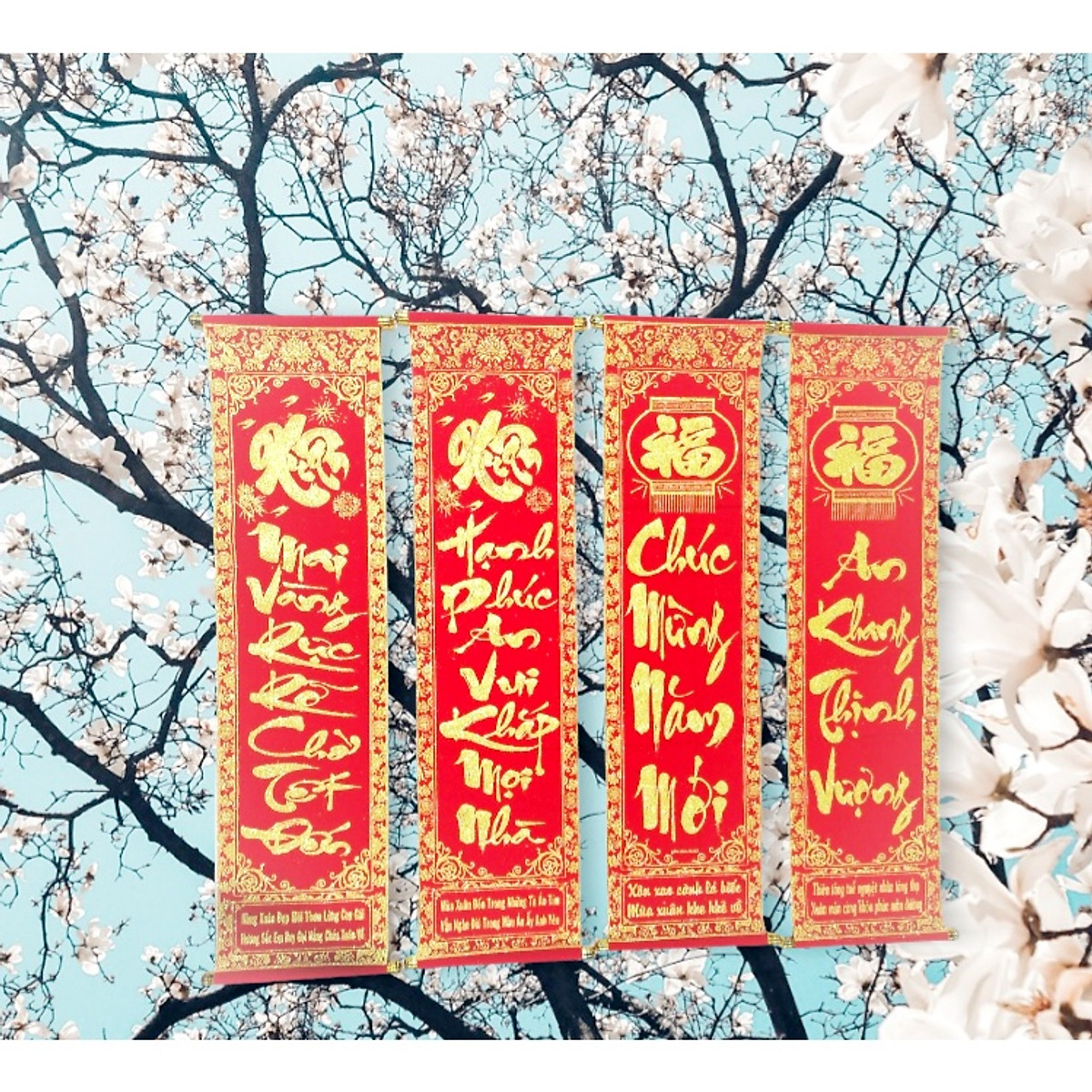 Câu đối Tết hay còn có tên gọi khác là Xuân liên hoặc liễn Tết, bao gồm hai vế đối nhau, nhằm thể hiện mong muốn, ước vọng, tâm tư, tình cảm mỗi người muốn gửi gắm mỗi dịp Tết đến xuân về. Cặp câu đối Tết này có kích thước 120cm x 32cm với chữ viết trên nền liễn nhung và phủ kim tuyến vàng lấp lánh. Những câu chúc được yêu thích là "Nước biển mênh mông không đong đầy tình mẹ - Mây trời lồng lộng không phủ kín công cha" hay "Mừng xuân nghinh phú quý - Chúc Tết đón vinh hoa",...