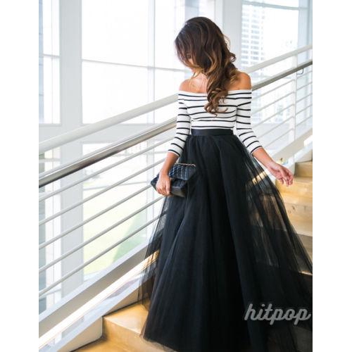 Set đầm dạ hội thiết kế riêng cho nàng công sở bận rộn, giúp bạn biến hóa từ quý cô văn phòng thành nữ hoàng đêm tiệc trong một nốt nhạc! Set gồm 2 món: Áo sọc đen trắng bằng cotton pha ngang vai ngang quyến rũ, phối cùng chân váy maxi vải tuyn xòe nữ tính. Váy có 2 lớp dày, tha thướt bồng bềnh, khiến bạn tỏa sáng lung linh như một nàng công chúa.