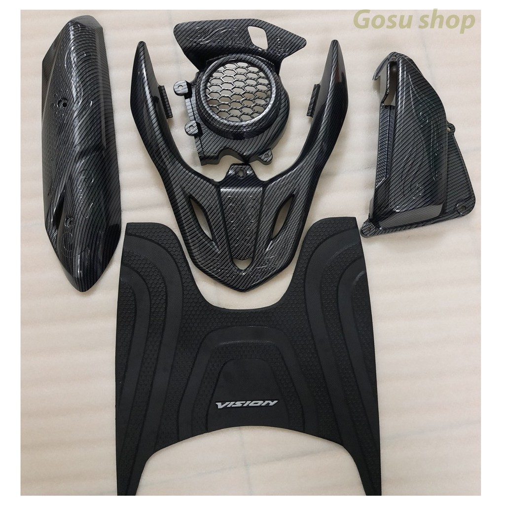 Xe Vision 2022 của bạn sẽ càng thêm bắt mắt với bộ phụ kiện trang trí vân cacbon này. Đây là bộ phụ kiện mang phong cách nổi bật, cá tính với thiết kế vân cacbon bóng, sáng và vô cùng sang trọng. Màu đen chủ đạo vừa hiện đại, tối giản vừa tạo điếm nhấm mạnh mẽ và năng động. Bộ phụ kiện bao gồm các phần ốp thân pô, ốp lọc gió (pô air), ốp quạt gió (két nước), ốp cảng sau (tay nắm sau), thảm chân và thảm lót chân. Bộ phụ kiện trang trí thêm này được thiết kế theo khuôn các bộ phận của xe nên rất dễ lắp đặt, bạn hoàn toàn có thể mua về và tự thao tác tại nhà.
