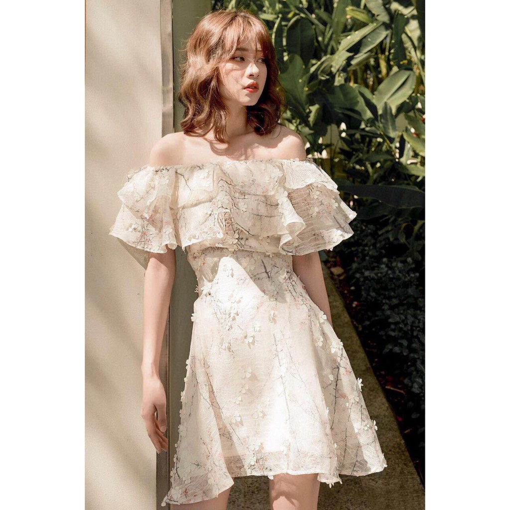 Đầm trễ vai hoa lá Mimi được làm bằng chất vài 3D, phù hợp cho các bạn gái có cân nặng dưới 60kg. Bốn màu trắng, kem, xanh, hồng cho phép các anh chàng thoả sức lựa chọn màu sắc phù hợp với sở thích và mong muốn của bạn gái mình! Kiểu dáng công chúa sẽ làm cho người con gái của bạn không chỉ trở nên dịu dàng và đằm thắm hơn bao giờ hết mà còn có thể ghi điểm trong mắt phụ huynh nếu hai bạn có ý định ra mắt với gia đình.