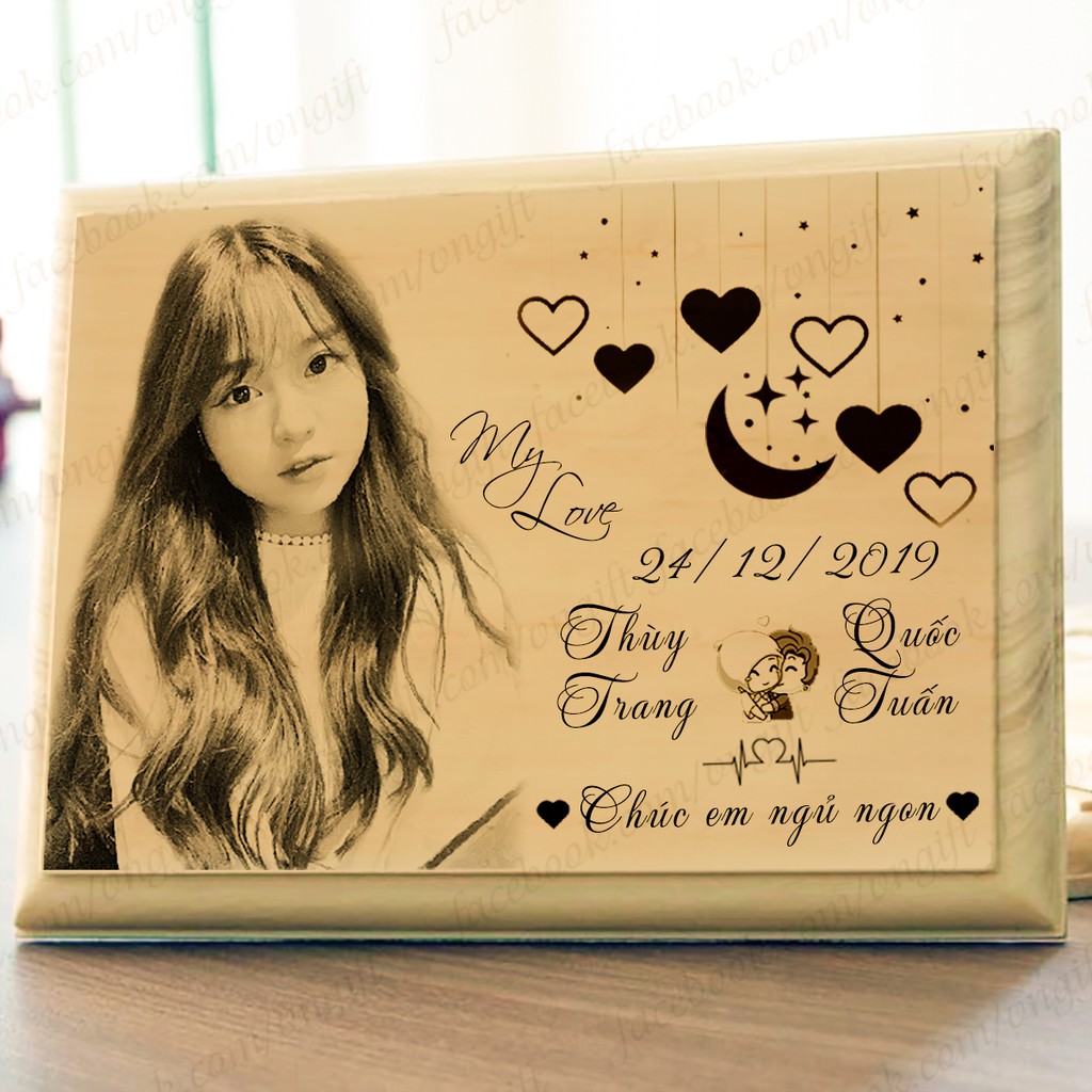 Tranh gỗ khắc theo yêu cầu sẽ được khắc sắc nét và tỉ mỉ lên tấm gỗ siêu bền. Nhờ sử dụng công nghệ khắc laser nên sản phẩm đạt đến độ chính xác cao ngay cả những đường nét nhỏ nhất. Tùy vào độ khó của sản phẩm mà thời gian khắc sẽ dao động từ 1 – 2 phút nên bạn có thể nhận được món quà tặng này nhanh chóng nhất. Về mẫu mã khắc sẽ tùy thuộc vào bạn lựa chọn. Nếu như bạn muốn tặng cho bạn gái thì có thể khắc ảnh của cô ấy kèm những lời nhắn nhủ yêu thương ở bên cạnh. Hoặc bạn có thể khắc hình của hai bạn để gửi đến cô ấy thông điệp rằng dù cô ấy có đang ở đâu thì bạn vẫn luôn đồng hành và lắng nghe. Với món quà tặng này bạn gái có thể để trang trí trong phòng mỗi khi nhìn thấy bức tranh sẽ luôn nhớ đến bạn.