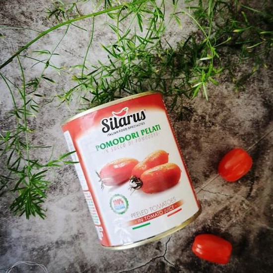 Những trái cà chua bên trong hộp cà chua Silarus này là những trá chín đỏ, được thu hoạch tại những nông trại ở Ý. Chúng được lột vỏ sẵn và đóng vào hộp thiếc cùng với nước ép cà chua tươi nguyên chất và không hề có chất bảo quản hay pha phẩm màu.