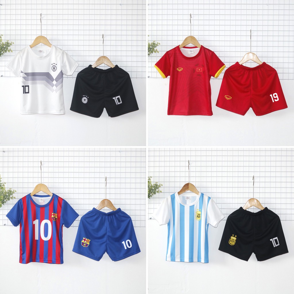 Được làm từ vải thun thể thao hạt mè cao cấp, bộ đồ thể thao trẻ em Viki Fashions này rất bền đẹp, có khả năng co dãn 4 chiều, thoát mồ hôi nhanh, phù hợp để bé diện trong thời tiết xuân hè. Từng đường may của sản phẩm đều được chăm chút tỉ mỉ, chắc chắn. Sản phẩm phù hợp để bé diện khi ở nhà, đi chơi hay sinh hoạt ngoài trời. Bộ đồ thể thao cho bé có các màu đỏ - Việt Nam, trắng đen - Đức, xanh đen - Inter, Barcelona và Argentina.