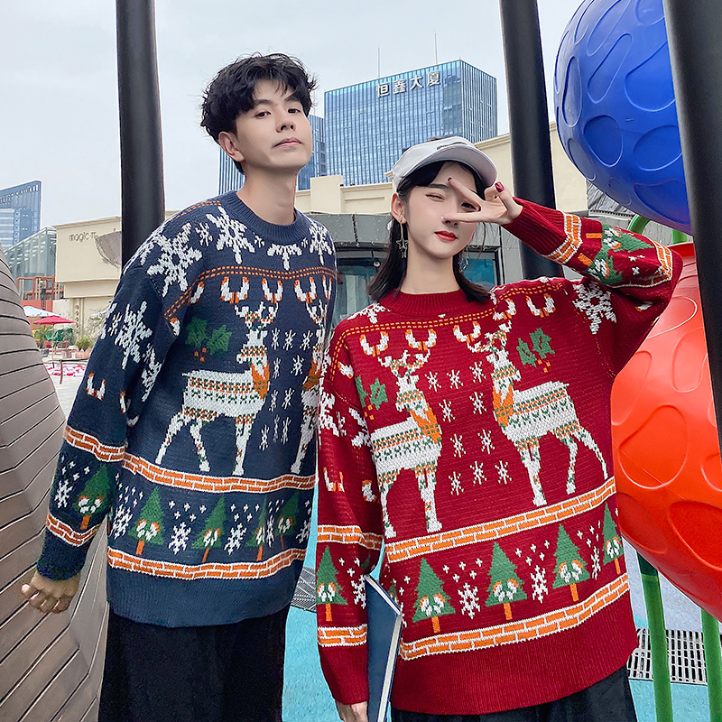 Áo len cổ tròn họa tiết tuần lộc chủ đề Giáng Sinh cho nam và nữ