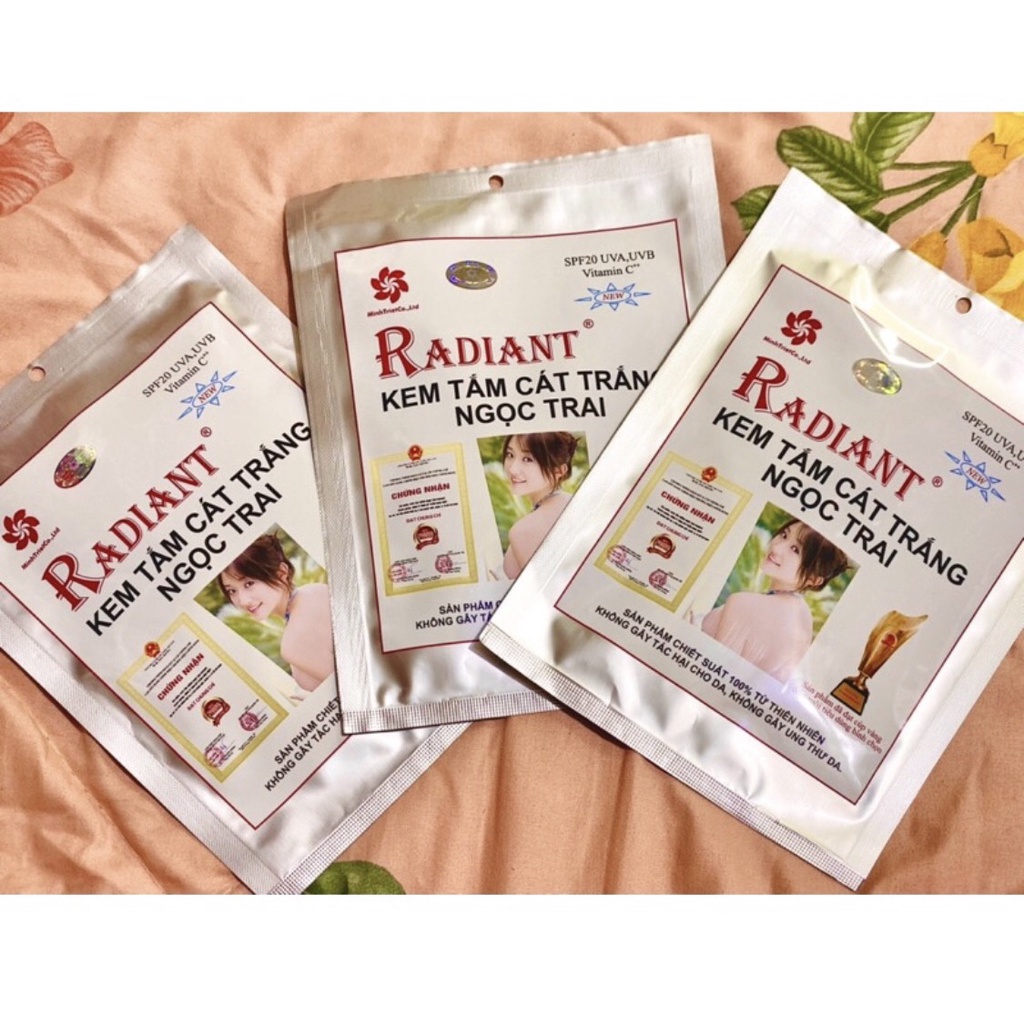 Sản phẩm kem tắm trắng cát ngọc trai Radiant là hàng xuất xứ từ Việt Nam với 100% thành phần thiên nhiên không gây kích ứng mẩn đỏ cho da hay gây mọc lông như các loại sản phẩm trôi nổi trên thị trường. Với sự kết hợp 24 vị thuốc bắc trên dây chuyền công nghệ sản xuất hiện đại, kem tắm trắng cát ngọc trai Radiant chắc chắn là sản phẩm cần có cho những chị em yêu làm đẹp muốn sở hữu cho mình làn da trắng hồng Ngọc Trinh.