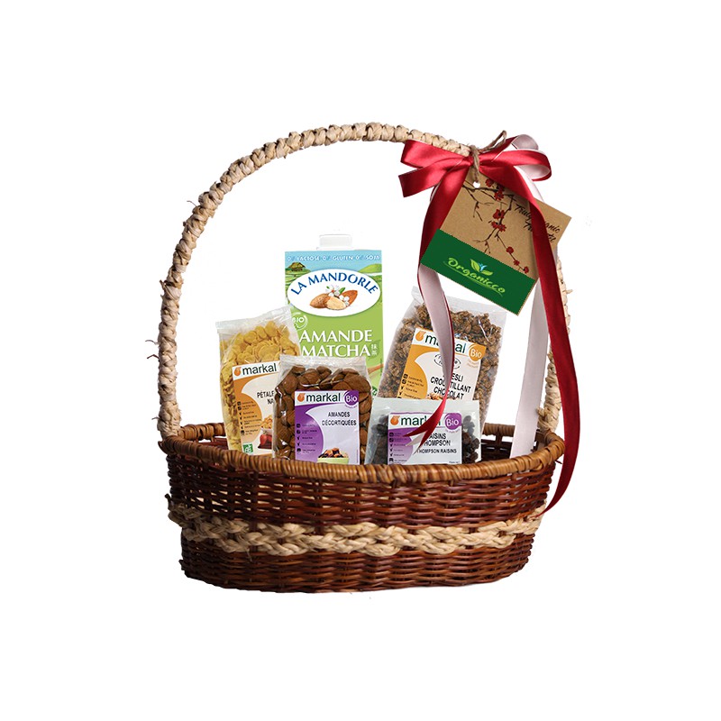 Thành phần giỏ quà gồm có: Ngũ cốc Muesli giòn socola hữu cơ Markal 375g; ngũ cốc hữu cơ bắp (ngô) cán dẹp Markal 200g; nho khô hữu cơ Thompson Markal 250g; sữa hạnh nhân Matcha hữu cơ La Mandorle 1L; hạt hạnh nhân hữu cơ đã tách hạt Markal 250g. Bộ phận người tiêu dùng quan tâm đến thực phẩm hữu cơ thường cũng ít đặt nặng vấn đề bao bì quá phô trương, mà thường yêu những màu sắc mộc mạc, giản dị.