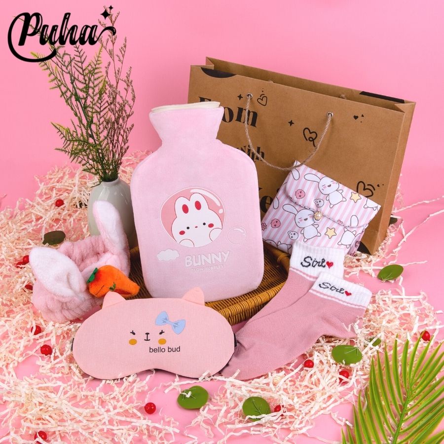 Mỗi set gift box sẽ bao gồm 1 túi chườm nóng bụng kinh có dung tích 350ml, 500ml hoặc 1000ml; 1 bịt mắt ngủ có gel; 1 túi vải đựng băng vệ sinh; 1 thiệp để nhắn gửi riêng cho nàng. Với set gift box 5 sẽ có thêm 1 đôi tất xinh xắn cùng 1 băng đô cùng màu với túi chườm. Tất cả những món quà này đều được đặt trong hộp craft trang trí theo phong cách vintage.