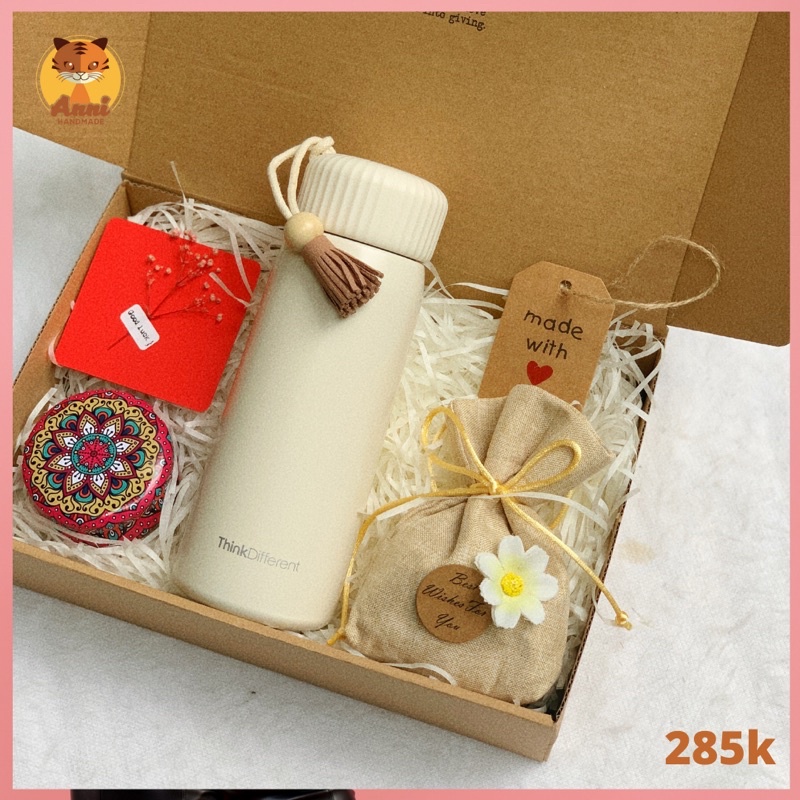 Set quà tặng handmade Beauty Gift Box sẽ giúp bạn truyền đạt hết những tình cảm, sự chân thành của bạn dành cho cho. Set quà này bao gồm 1 bình giữ nhiệt, 1 hũ nến thơm handmade, 1 túi nụ hoa khô lavender handmade, 1 tấm thiệp mini. Với món quà này, cô gái của bạn có thể thư giãn sau những giờ học tập, làm việc mệt mỏi. Bạn còn có thể gửi gắm những lời chúc, lời nhắn nhủ tình cảm dành cho nàng trong tấm thiệp mini.