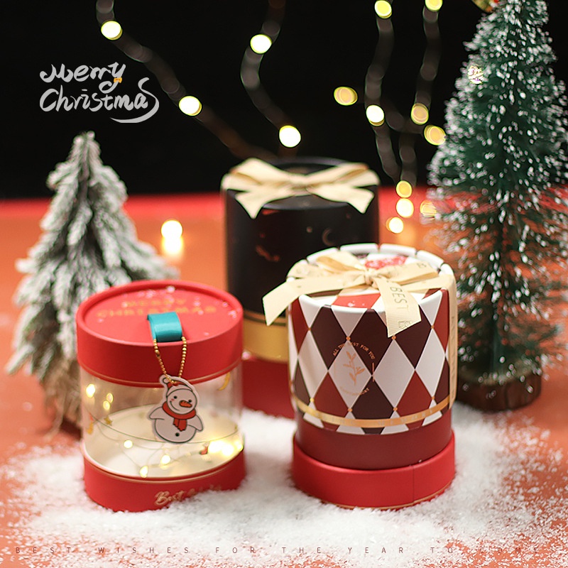 Hộp quà Giáng Sinh này có hình trụ với phần đáy và nắp được làm từ giấy cotton màu đỏ cực kỳ bắt mắt cùng với phần đáy bên trong được lót bằng lụa trắng bật lên sự sang trọng. Phần thân hộp được làm bằng nhựa PVC trong suốt như kính và có độ bền cao nên tuy nhìn hộp quà có vẻ mỏng manh nhưng thực tế lại bền bỉ hơn bạn tưởng nhiều. Bạn có thể chọn giữa 2 mẫu là hộp có đèn LED trang trí cùng hoặc không tùy theo nhu cầu của mình.