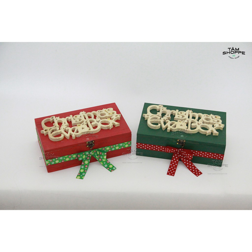 Hộp quà được làm từ chất liệu gỗ tự nhiên với kích thước 30cm x 18cm, cao 10cm; khối lượng 1400 gram. Với 2 màu sắc chủ đạo của mùa Giáng Sinh là xanh và đỏ được cột một dây ruy băng bên ngoài, phía trên nắp hộp có dòng chữ "Christmas Eve Box" được khắc nổi vô cùng nổi bật càng tạo nên sự thu hút cho chiếc rương gỗ này. Bạn có thể dùng để đựng trang sức, kẹo hay các món quà có kích thước vừa với rương gỗ, người nhận khi cầm món quà trên tay chắc chắn sẽ không khỏi bất ngờ và tò mò không biết liệu bên trong hộp quà này chứa đựng điều bất ngờ gì đấy.