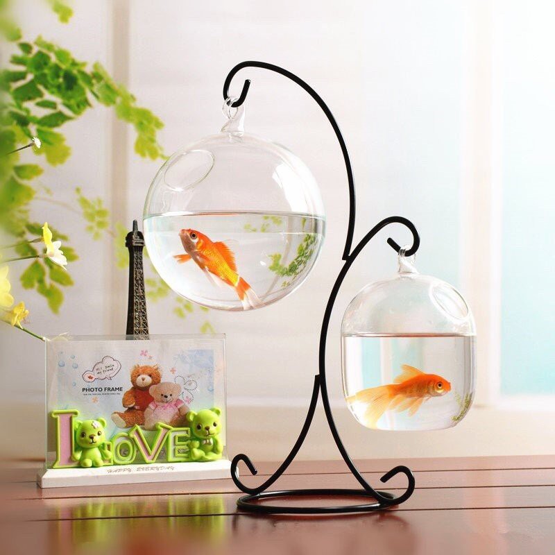 Bể cá mini này bao gồm các sản phẩm như giá treo hình chữ C với chiều cao 22cm được làm bằng chất liệu thép sơn tĩnh điện không sợ bị hoan gỉ, bình thủy tinh treo trên giá chữ C có hình quả dưa với chiều cao 12cm x rộng 10cm, được chế tác với chất liệu thủy tinh vô cùng cao cấp không hề xuất hiện sủi bọt. Người mua được tặng kèm một cây trang trí cho bình thủy tinh bằng nhựa màu sắc sẽ ngẫu nhiên theo đơn hàng bạn đặt.