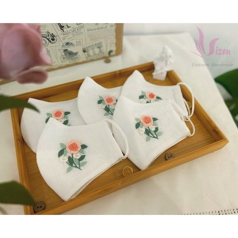 9. Khẩu trang vải linen tự nhiên thêu tay