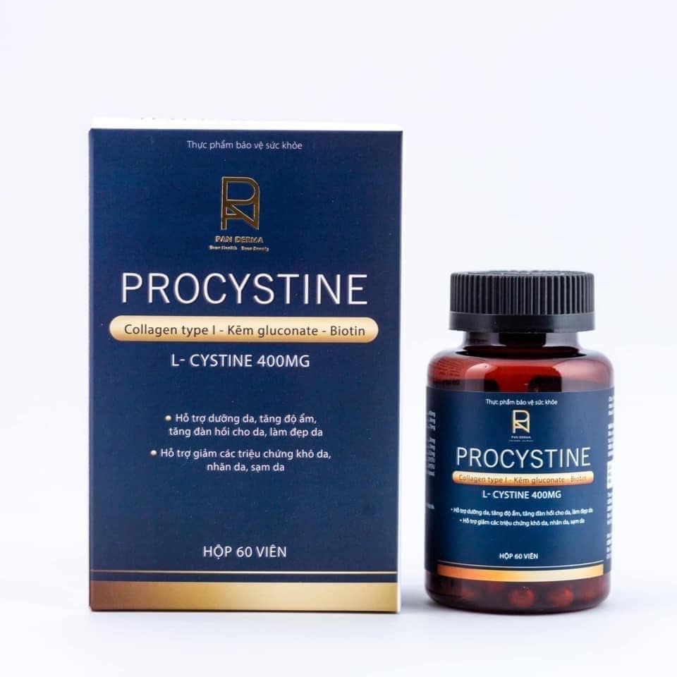 Sở hữu các thành phần như L – Cystine 400mg, collagen type I 90mg, kẽm gluconate 70mg, vitamin C 30mg, biotin 0,5mg và một số thành phần khác, viên uống Procystine đem đến công dụng tăng cường độ ẩm, độ đàn hồi cho da, giúp da đẹp mịn màng, làm giảm các triệu chứng khô da, sạm da, nhăn da, cho làn da căng mềm, tươi tắn. Sản phẩm được bào chế dạng viên nang, dùng cho người lớn với liều lượng mỗi lần 1 viên, mỗi ngày 2 lần.
