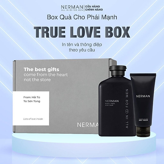 Bộ quà tặng nam giới True Love Box gồm hai sản phẩm bao gồm một sai gel tắm gội và một chai gel rửa mặt. Đầu tiên là chai gel tắm gội rửa mặt 3in1. Sữa tắm hương nước hoa cao cấp của hãng Nerman là một sản phẩm tiện lợi với sự tích hợp 3 công dụng trong 1 bao gồm tắm, rửa mặt và gội đầu. Sản phẩm sẽ giúp nam giới không phải đau đầu suy nghĩ nên mua cái gì để chăm sóc cho từng vùng cơ thể khác nhau.