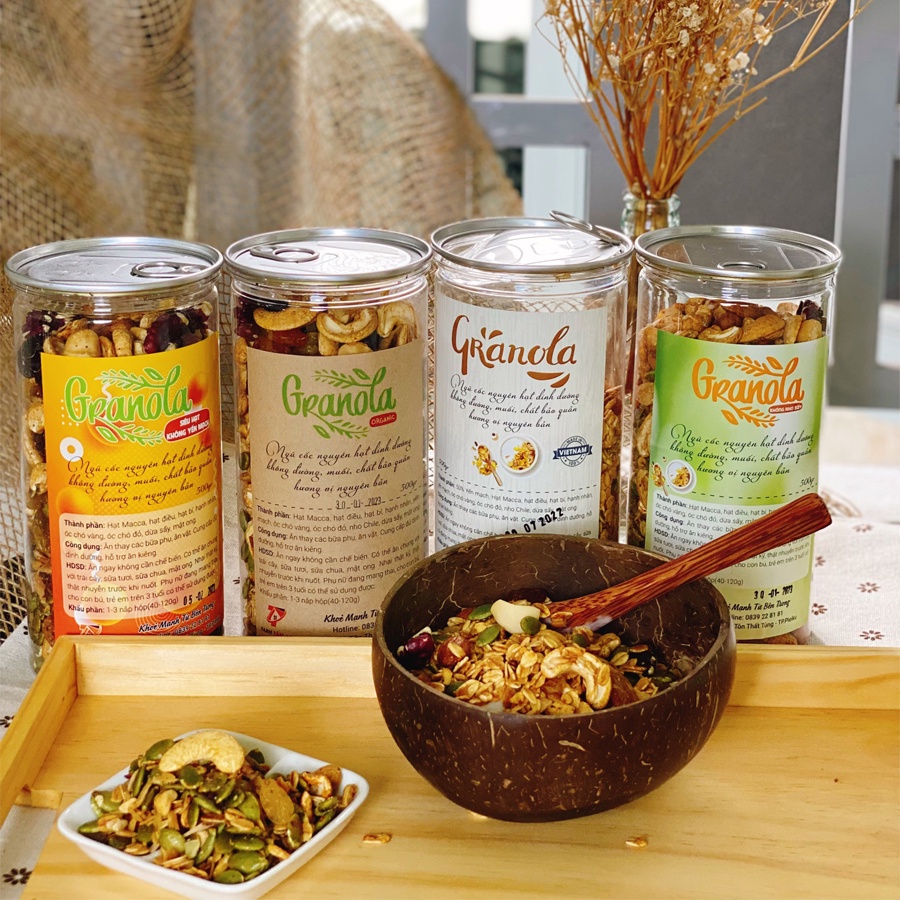 Thời gian gần đây Granola siêu hạt đang là sản phẩm cực hot dùng làm bữa ăn dinh dưỡng cho những người không có nhiều thời gian chuẩn bị bữa sáng như các thầy cô giáo. Bạn có thể tặng thầy cô một hộp Granola để làm quà nhân ngày 20/11, chắc chắn thầy cô sẽ yêu thích món quà này. Granola siêu hạt ít yến mạch Farm Tâm An là sản phẩm được mix từ 7 loại hạt dinh dưỡng cao cấp như macca, hạt điều, hạt bí xanh Ấn Độ, hạnh nhân Úc, yến mạch, óc chó vàng, óc chó đỏ Mỹ kèm theo đó là nho Chile, dừa sấy, mật ong được nướng giòn với màu vàng nâu trông rất bắt mắt.