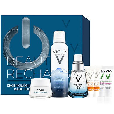 Vichy là một thương hiệu dưỡng da nổi tiếng của Pháp với những sản phẩm được kiểm nghiệm khắt khe về độ an toàn và dịu nhẹ cho làn da dưới sự giám sát của các chuyên gia về da liễu. Các sản phẩm chăm sóc da giàu khoáng chất đến từ thương hiệu Vichy vô cùng an toàn, lành tính, không gây kích ứng dù với làn da nhạy cảm và khó tính nhất. Bộ sản phẩm Vichy Beauty Recharge Box với khả năng phục hồi chuyên sâu, giúp tái tạo và bảo vệ làn da một cách tối ưu bao gồm 7 món sản phẩm: 1 dưỡng chất khoáng cô đặc Mineral 89 30ml, 1 nước khoáng dưỡng da Vichy Mineralizing Water 150ml, 1 kem Gel dưỡng ẩm dành cho da dầu hỗn hợp Aqualia Gel Cream 15ml, 2 kem chống nắng bảo vệ da và ngăn ngừa lão hóa Ideal Soleil Anti aging 3ml và 2 kem dưỡng tác động kép dành cho da dầu mụn Normaderm Phytosolution 3ml.