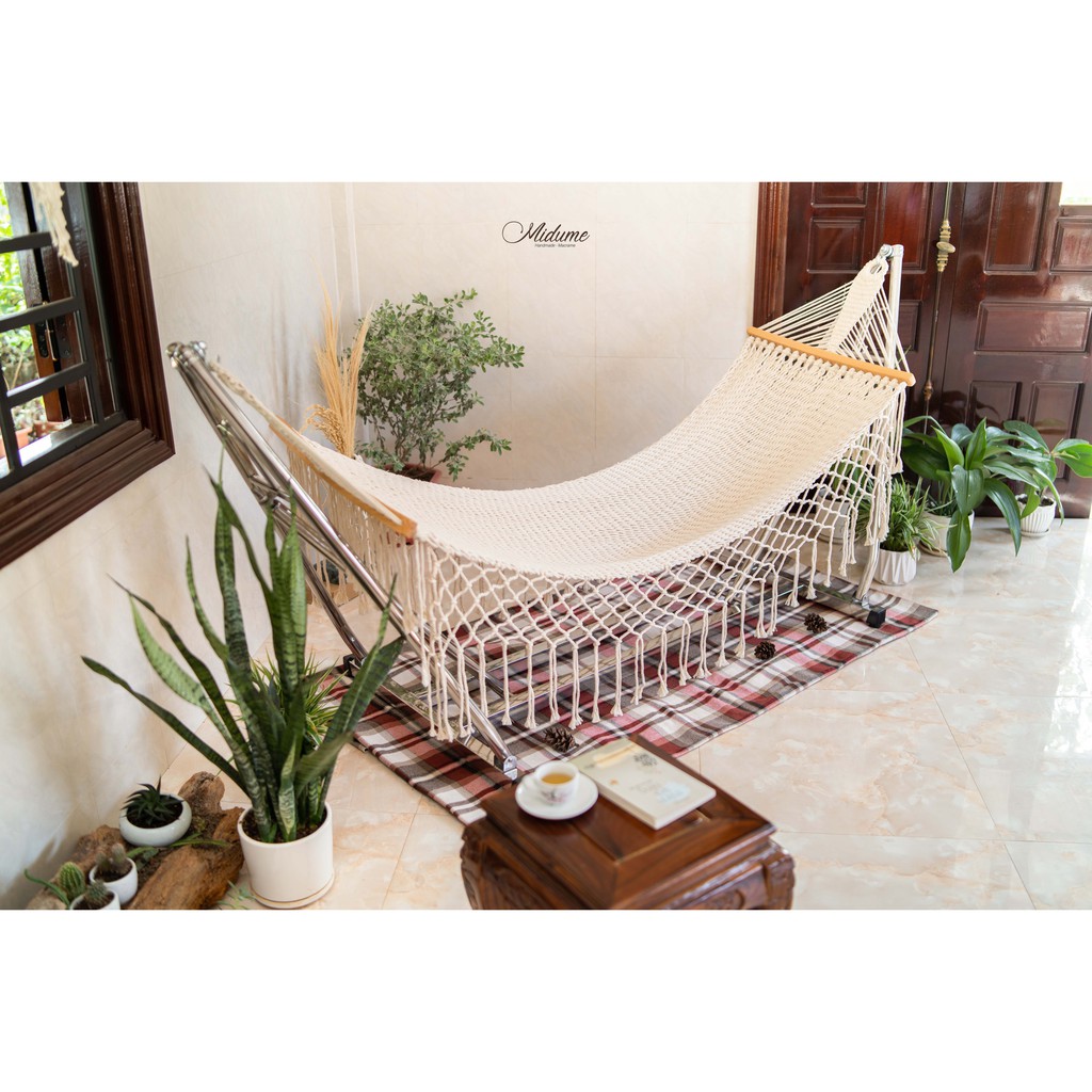 Võng lưới Macrame được làm hoàn toàn bằng thủ công từ những nghệ nhân làm võng có tâm với nghề. Võng được đan theo dạng lưới và có trang trí dạng lưới thả tua rua hai bên, tạo cho bạn cảm giấc như đang thư giản tại bãi biển mùa hè mát lành. Chất liệu cotton mang đậm phong cách vintage rất thanh lịch. Sản phẩm có nhiều kích thước với 36 màu cho bạn lựa chọn không gian phù hợp nhà mình.