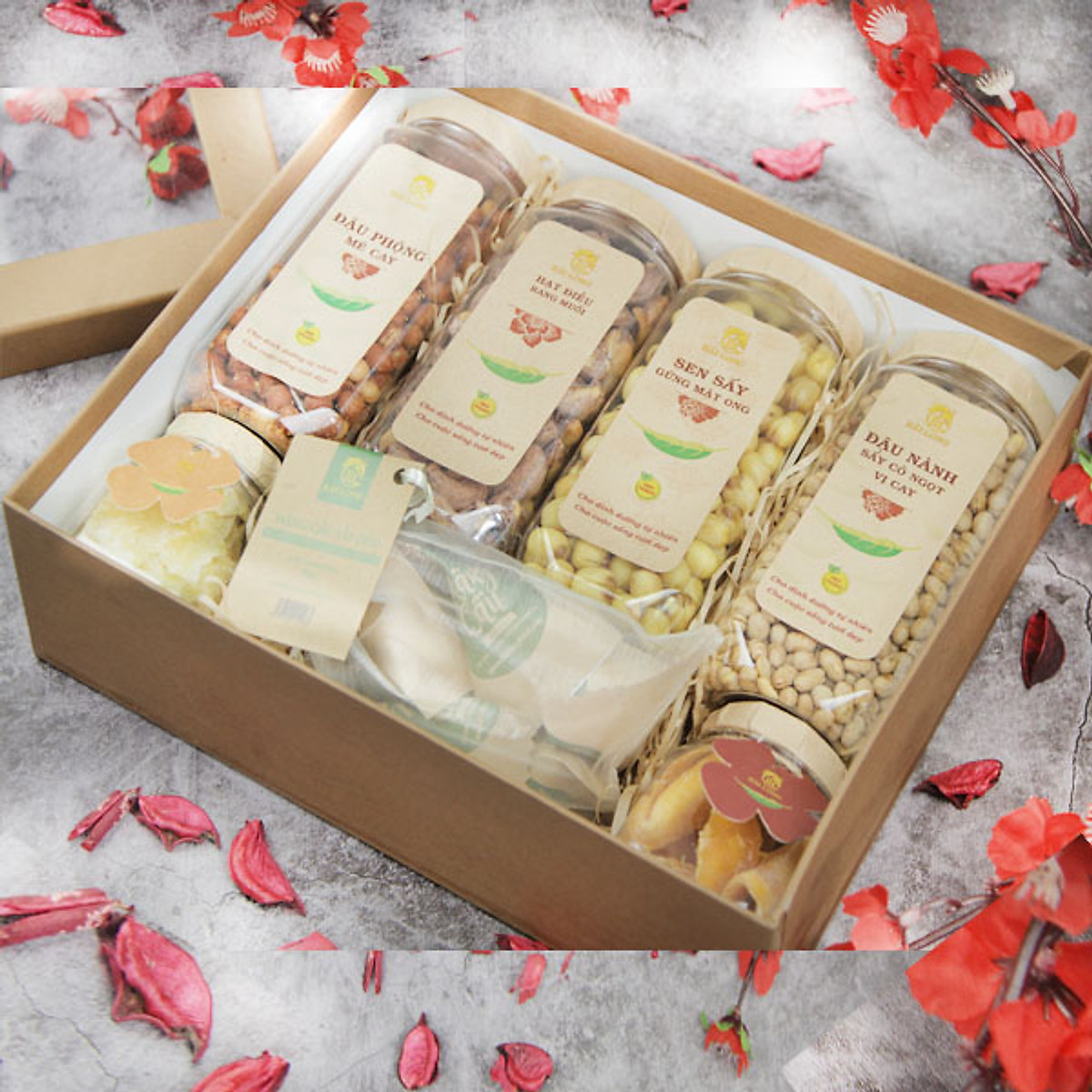 Mang đầy đủ các sắc thái hương vị khác nhau từ ngọt bùi dịu nhẹ cho đến chua cay, giòn tan vui miệng, bộ sản phẩm này sở hữu 07 loại hạt và mứt khác nhau, bao gồm: Đậu nành sấy cỏ ngọt vị cay ấn tượng (230gr), hạt sen sấy gừng mật ong bổ dưỡng (230gr), đậu phộng mè cay lạ miệng (250gr), hạt điều rang muối vỏ lụa béo bùi (250gr), xoài sấy dẻo chua ngọt (80gr), mứt gừng sấy ấm họng (80gr) và túi von mãng cầu sấy dẻo độc đáo (80gr). Ngoài ra, hãng cũng cam kết không sử dụng các chất bảo quản, chất tạo màu trong sản phẩm nên bạn có thể yên tâm chọn mua và sử dụng nhé!